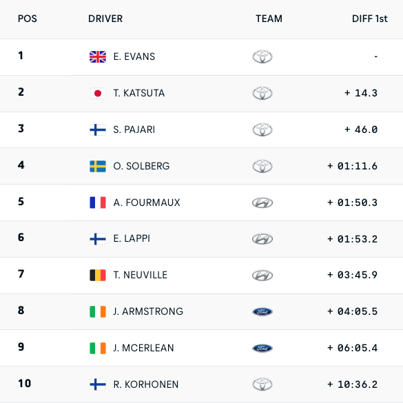 Иначе в края на ралито Еванс спечели с аванс от 14.3 пред Кацута, а на подиума заедно с тях се качи Паяри, за когото това е второ призово класиране в кариерата в Rally1. Солберг се класира четвърти в домашното си състезание пред Фурмо, Лапи, Нювил, Джон Армстронг (М-Спорт), Джошуа Макърлийн (М-Спорт) и победителят в WRC2 Роопе Корхонен, които оформиха зоната на точките. От неделните три етапа точки взеха Еванс, Кацута, Солберг, Паяри и Фурмо.