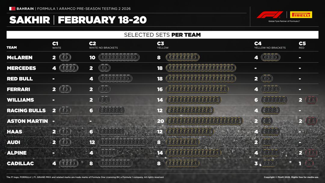 Официалният доставчик на гуми във Формула 1 Пирели обяви с какви гуми ще разполага всеки отбор по време на предстоящия втори тридневен тест в Бахрейн.