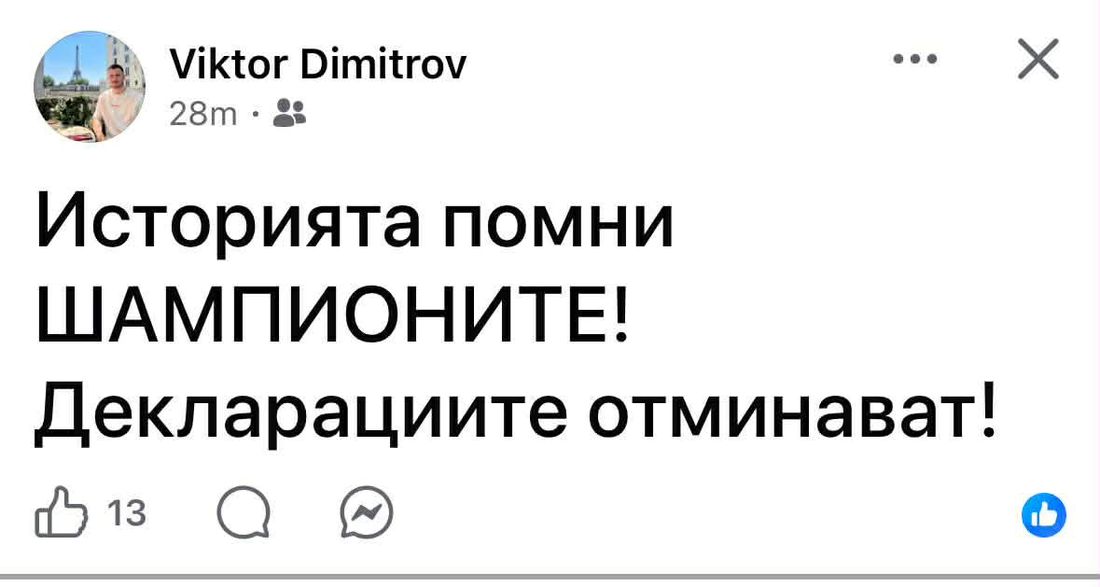"Историята помни ШАМПИОНИТЕ! Декларациите отминават!", написа в профила си във Facebook синът на Херо.