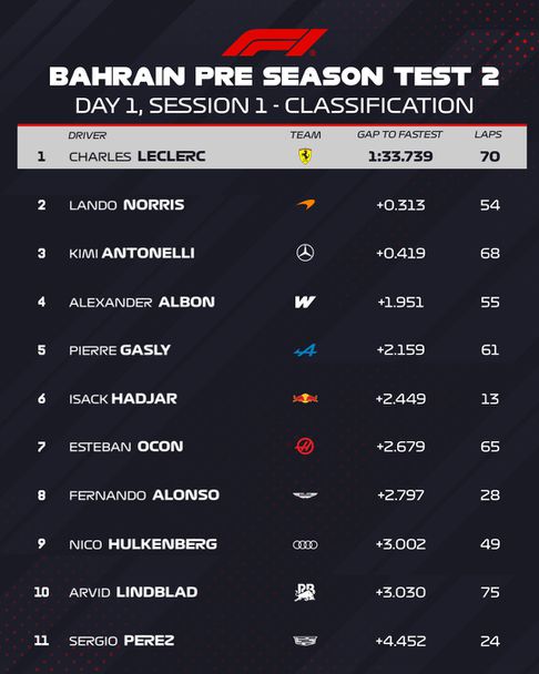В нея монегаскът постигна най-добро време от 1:33.739, което е със само 0.070 секунди по-слабо от най-добрата обиколка, която беше записана в рамките на първия тест в Бахрейн миналата седмица. Леклер беше единственият пилот, който слезе под 1:34 до обяд днес, осигурявайки си аванс от 0.313 пред световния шампион Ландо Норис. Тройката с пасив от 0.419 допълни Андреа Кими Антонели, който записа най-продуктивния си полуден от началото на изпитанията в Бахрейн.