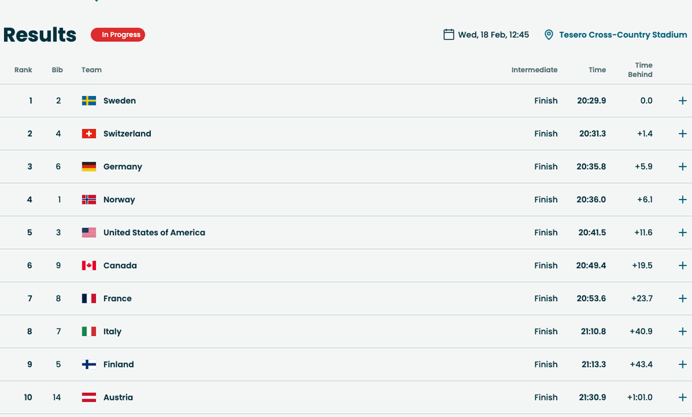 Йона Сундлинг и Мая Далквист бяха най-бързи по трасето в Тезеро като дадоха време 20:29.99 минути. Йона Судлинг е олимпийска шампионка в индивидуалния спринт от Игрите в Пекин преди четири години, като в Тезеро остана със сребърен медал на 10 февруари след сънародничката си Лин Сван. Тя е и трикратна световна шампионка. Мая Далквист има два сребърни (в спринта и в отборния спринт) и един бронзов медал (в щафетата) от Олимпийските игра в Пекин.