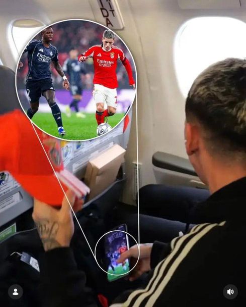 “Марка” показа снимка на аржентинeца от самолет, на която се вижда смартфонът му. Любопитното е, че снимката на заключения екран на телефона му е такава, на която са двамата с Жуниор. Тя е от предишния двубой между двата клуба на 28 януари, който беше от последния кръг в основната фаза на турнира.