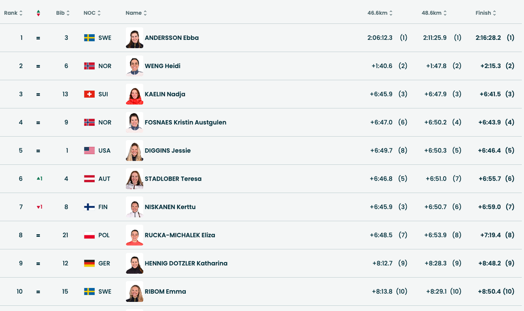 Във финален спринт трета с бронза завърши швейцарката Надя Келин, която изпревари Кристин Фоснес от Норвегия и славната американка Джеси Дигинс, за която това бе последно състезание в кариерата. Надя Келин има сребърен медал с тима на Швейцария в отборния спринт на Олимпийските игри в Милано-Кортина.