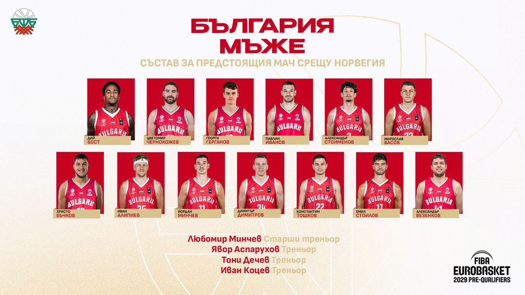 Селекционерът на България Любомир Минчев избра група от 13 състезатели, които ще се подготвят за мачовете от предквалификациите за ЕвроБаскет 2029. На представителния ни тим му предстоят двубои като гост срещу Норвегия на 27 февруари от 21:00 часа и срещу Армения на 2 март от 18:15 часа.