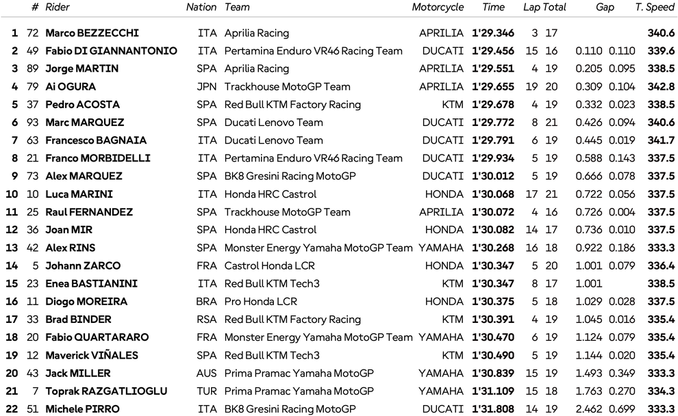 Педро Акоста допълни челната петица със своя КТМ, а световният шампион Марк Маркес се нареди на шестата позиция при своето първо участие в състезателен уикенд от началото на октомври миналата година. Зад него в топ 10 попаднаха още съотборникът му Франческо Баная, Франко Морбидели, Алекс Маркес и Лука Марини.