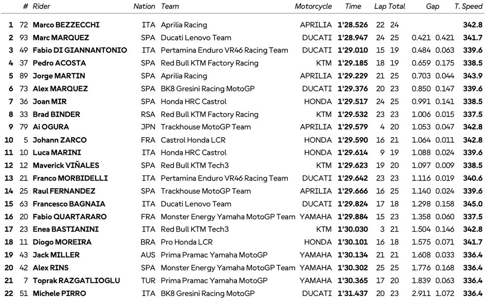 Първи извън десетката остана Лука Марини, който беше с 0.024 по-бавен от Зарко в спора за последното място в топ 10 и ще трябва да минава през първата фаза на квалификацията. В нея компания на италианеца ще правят Маверик Винялес, Франко Морбидели, Раул Фернандес, Франческо Баная, Фабио Куартараро, Енеа Бастианини, Диого Морейра, Джак Милър, Алекс Ринс, Топрак Разгатлиоглу и тестовият пилот на Дукати Микеле Пиро, който кара на мястото на контузения Фермин Алдегер в състава на Грезини.