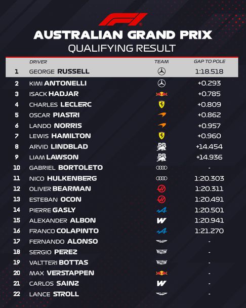 Британецът завоюва първата позиция в квалификацията в Мелбърн с време от 1:18.518, с което той изпревари с 0.293 секунди своя съотборник Андреа Кими Антонели, който ще стартира втори. От третата позиция в своя дебют за Ред Бул ще потегли Исак Хаджар, който обаче изостана с цели 0.785 от Ръсел в края на битката за полпозишъна.