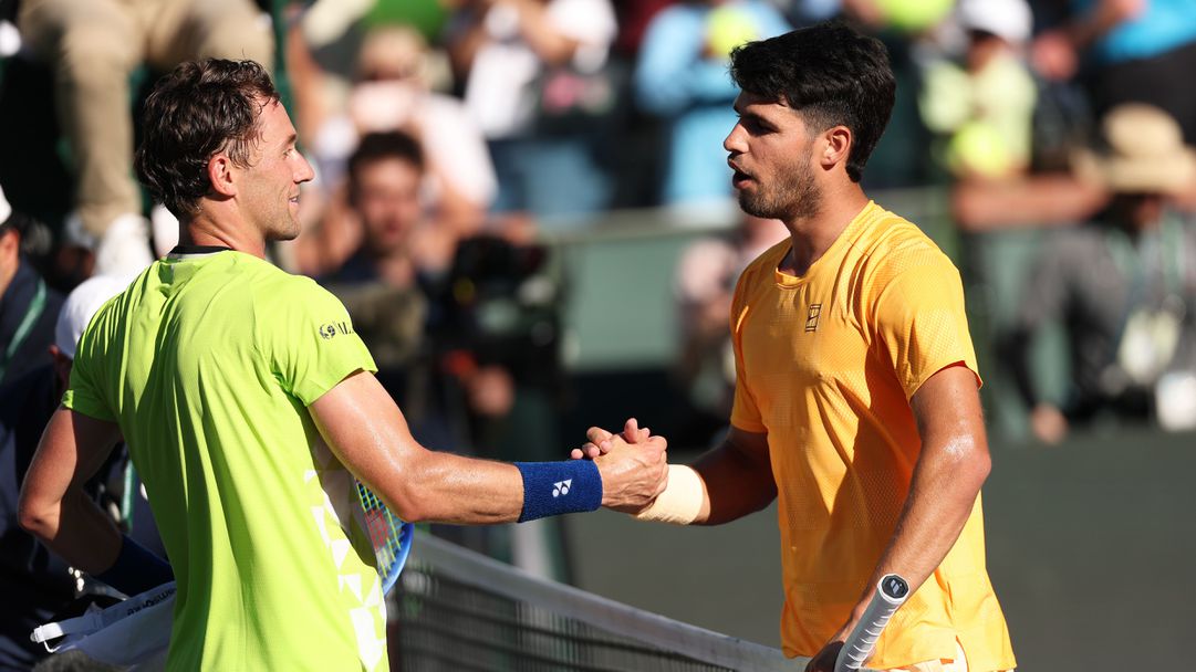 Алкарас имаше много повече проблеми в предишния кръг, когато трябваше да прави обрат срещу Артур Риндеркнех. Испанецът поведе с 5:0 в първия сет и даде само един гейм на съперника си. Рууд се държа значително по-раявностойно на корта във втораат част. Норвежецът стигна до тайбрек, но в него изостана от самото начало и нямаше шанс да удължи двубоя. Все пак, 13-тият в света норвежец накара публиката да стане на крака с атрактивен удар между краката, който завърши с точка в негова полза.