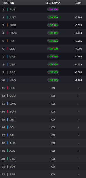 Първи извън челната десетка на старта в спринта утре ще бъде Нико Хюлкенберг, който в края на SQ2 беше със само 0.015 по-бавен от Хаджар в спора за последното място в топ 10. Заедно с германския пилот на Ауди елиминирани бяха още Естебан Окон, Лиам Лоусън, Габриел Бортолето, Арвид Линдблад и Франко Колапинто.