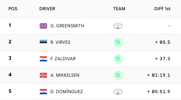 Челната десетка оформя лидерът в WRC2 Гас Грийнсмит с Тойота, който има преднина от 5.5 пред Роберт Вирвес (Шкода). Трети в категорията е Фабрицио Салдивар (Шкода), който изостава с 37.3 от Грийнсмит и води с 41.8 пред Андреас Микелсен (Шкода). Между Вирвес и Салдивар в общото класиране се движи Джош Макърлийн, който и днес имаше проблеми с охлаждането на своя автомобил, който прегря в първия етап за деня.