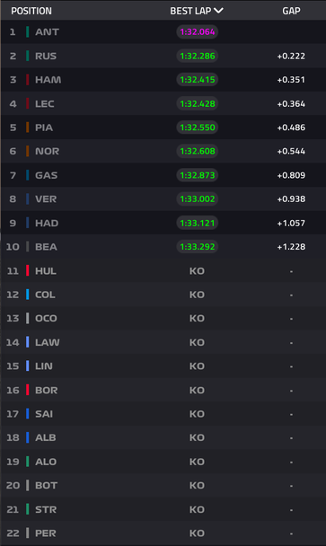 В единствената си обиколка Ръсел постигна резултат от 1:32.286, който беше с 0.222 секунди по-бавен от времето от 1:32.064, с което Антонели завоюва полпозишъна. Трети на стартира утре ще застане Люис Хамилтън, който завърши на 0.351 зад своя наследник в екипа на Мерцедес.