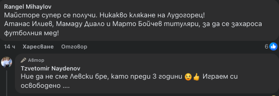 Един от феновете призова спонсора на "червените" от Бистрица: "Майсторе, супер се получи. Никакво клякане на Лудогорец! Атанас Илиев, Мамаду Диало и Марто Бойчев титуляри, за да се захароса футболния мед!". Отговорът на Найденов беше: "Ние да не сме Левски бре, като преди 3 години. Играем си освободено".