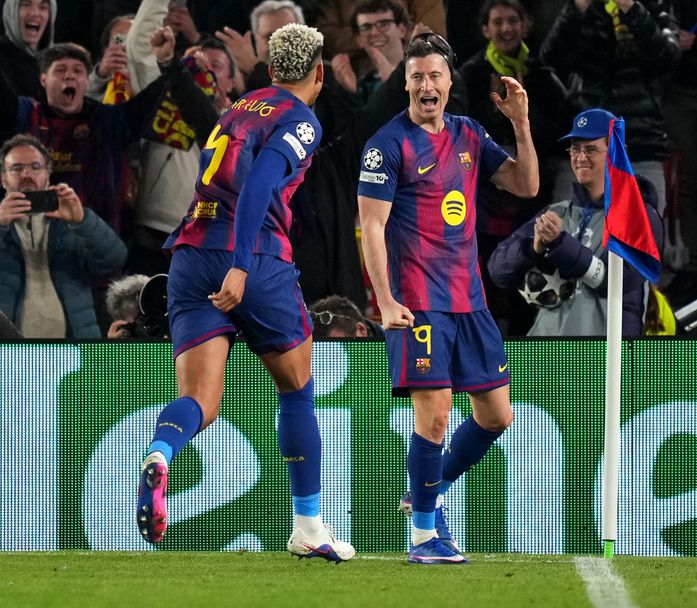 Равенството 1:1 седмица по-рано предвещаваше поне равностоен двубой и това наистина беше така през първото полувреме. На два пъти домакините повеждаха - чрез Рафиня (6’) и Марк Бернал (18’), но и в двата случая тимът на Нюкасъл успяваше да отговори с изравнителни голове на Антъни Еланга (15’, 28’). Чак към края на тази част каталунците наложиха предимство и направиха два 100-процентови пропуска чрез Левандовски и Ямал. Все пак в края на полувремето Ямал реализира за 3:2 от наказателен удар.