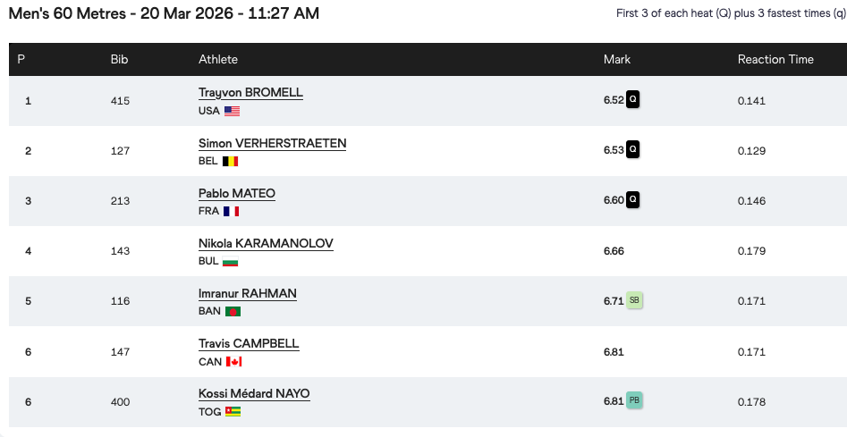 Втори финишира Симон Верхерщрайтен от Белгия с 6.53, а трети остана Пабло Матео от Франция с 6.60 секунди.