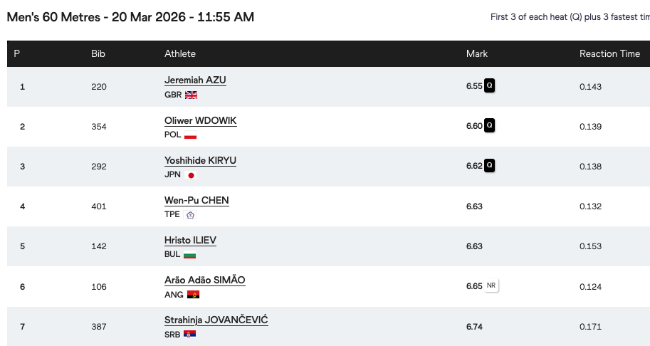 Националният рекордьор Илиев се нареди 5-и в шеста серия с 6.63 секунди, а първи финишира защитаващият титлата си и европейски шампион Джеремая Азу (Великобритания) с 6.55 секунди.