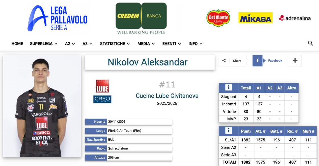 Общо в Суперлигата на Италия, Купата на Италия и Суперкупата на Италия Алекс Николов е реализирал 562 точки за Лубе (69 аса, 31 - блока, 52,3 % ефективност в атака).
