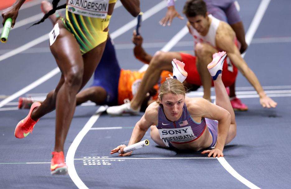 В състезание, изпълнено с толкова драма, колкото и еквивалентът му на открито, смесената щафета на 4х400 метра на Световното първенство по лека атлетика в зала в Торун 26 беше спечелена от отбора, който най-добре успя да избегне неприятностите. Белгия триумфира с титлата с време 3:15.60 – най-бързото постижение на къса писта в най-новата дисциплина от програмата на шампионатите в зала.