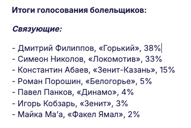 Плеймейкърът на Локомотив (Новосибирск) Мони Николов получи 33% от фенския вот, а първото място изнанадващо зае опитният Дмитрий Филипов от Горкия с 38%.