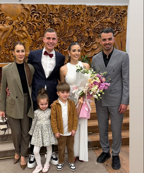 Двамата сключиха брак в компанията на най-близките си хора. Кумове им бяха бившият защитник на Локомотив (София) и Славия и неговата половинка.
