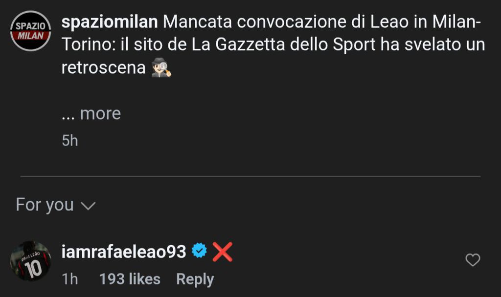 Въпреки това, Леао отговори в Инстаграм, като в коментар под материал по темата публикува символ, който ясно показа позицията му – червен кръст.