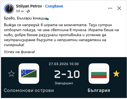 Футболистът с най-много мачове за националния отбор на България - Стилиян Петров, публикува ироничен коментар за "трикольорите" след победата ни с 10:2 над Соломонови острови в Индонезия.