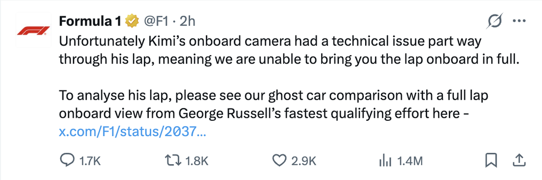 В днешната публикация описанието също каза, че това е онборд обиколка, но проблемът е, че не цялата обиколка се показва от тази камера. Вместо това кадърът се сменя на такъв от камерите край пистата когато Антонели преминава през „Лъжицата“ и до края на обиколката повече не се вижда кадър от онборд камерата на италианеца.