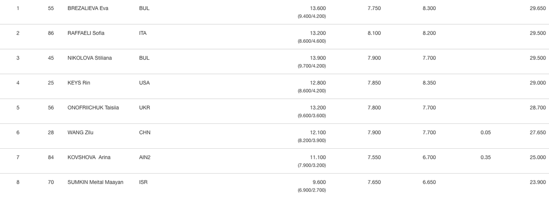 Четвърта е американката Рин Кейс с 29.000, а едва пета остана абсолютната европейска шампионка от Талин 2025 и шампионка в многобоя от София Таисия Онофричук, която получи 28.700.