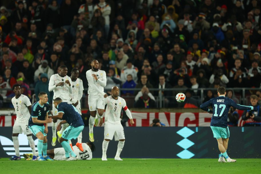 В първия четвърт час ганайците направиха комедия от грешки и многократно позволиха на съперника си, който играеше в резервните тъмно сини спортни екипи, да приближи тяхната врата опасно. Най-необмисленото действие на гостите дойде в 5-ата миниута, което дори застраши здравето на противников футболист. Хавертц получи извеждащ пас зад последния в отбраната и тъкмо преди да се откъсне в пеналтерията очи в очи със стража на Гана - Бенджамин Асаре, защитникът Йонас Аджей Аджетей прегази германеца с брутално нарушение. Главният съдия от Стюарт Атуел в случая демонстрира благосклонност и предвид ранния етап на мача и приятелския му характер, даде само жълт карто за ганайския футболист. Бундестимът от своя страна получи правото да изпълни пряк свободен удар от опасна дистанция, но Флориан Виртц не успя да вкара фамозен гол, както в предходния мач срещу Шявейцария и прати топката в аут след изпълнението на статичното положение.