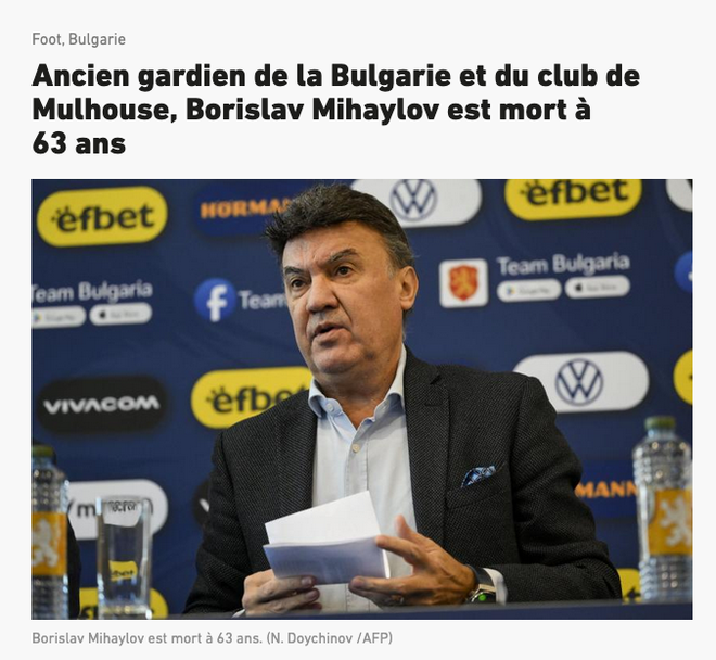 “`Бившият вратар на България и Мюлуз Борислав Михайлов почина”, казва френският “L’Equipe и припомня участието му в емблематичната вечер на “Парк де Пренс” на 17 ноември 1993 година.