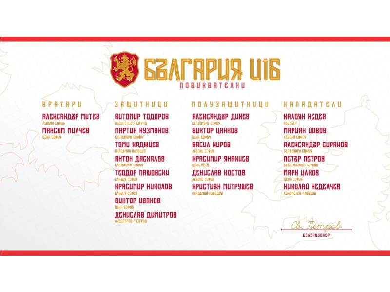 Селекционерът на България U16 Светослав Петров обяви разширения състав за предстоящия Турнир за развитие на УЕФА, който ще се проведе на терените на efbet Национална футболна база между 4 и 8 април. Надпреварата ще събере четири отбора, като освен България, участие ще вземат съставите на Косово, Грузия и Южна Африка.