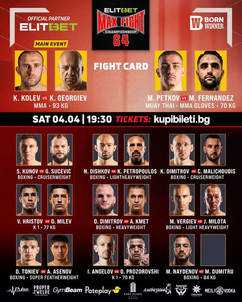 Тази вечер от 19:30 часа е дългоочакваната галавечер MAX FIGHT 64 в новата зала на Военна академия в София.