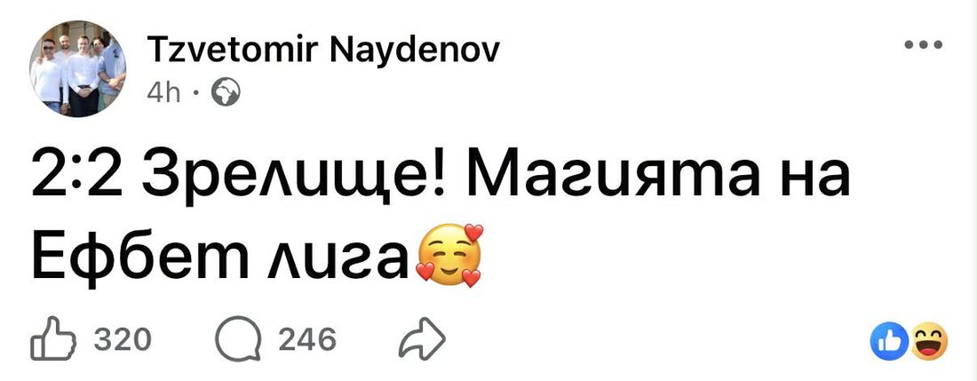 “2:2 Зрелище! Магията на Ефбет лига”, написа по този повод Найденов.