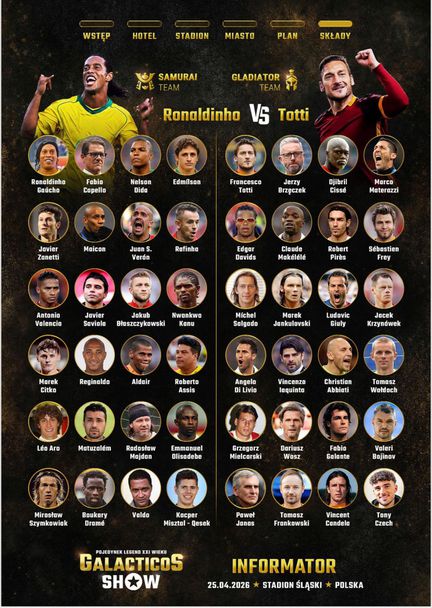 Този път спектакълът е на голям терен. Сред съотборниците на Тоти и Божинов са още Джибрил Сисе, Марко Матераци, Едгар Давидс, Клод Макелеле, Робер Пирес, Мичел Салгадо, Людовик Жули, Венсан Кандела, Марек Янукаловски, Винченцо Якуинта, Кристиан Абиати, Анджело Ди Ливио, Фабио Галанте, Себастиян Фрей и доста полски легенди. Треньор на тима ще бъде Йежи Бженчек, който води Полша между 2018 и 2021 г., а година по-рано изведе Висла Краков до титлата на Полша.