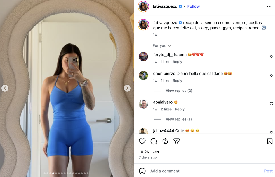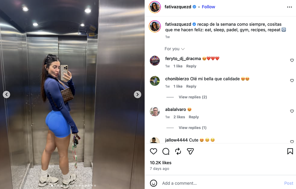 Инфлуенсърът Фати Васкес напомни за апетитните си форми с нова порция снимки в Инстаграм. Брюнетката, която имаше връзка с футболната звезда Ламин Ямал, определено има какво да покаже и отново го направи с една от последния си публикации.