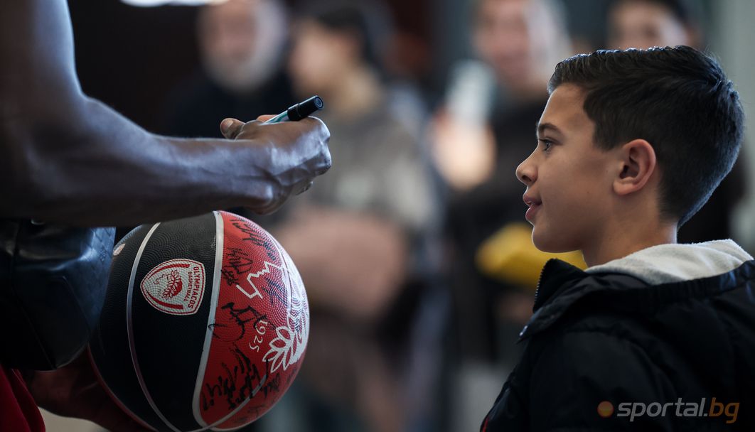 Едно от децата, които тръпнеше в очакване на звездите на гръцкия гранд пристигна с топка на Олимпиакос и с огромно търпение изчака всеки един от баскетболистите на Йоргос Барцокас да се разпише върху нея.