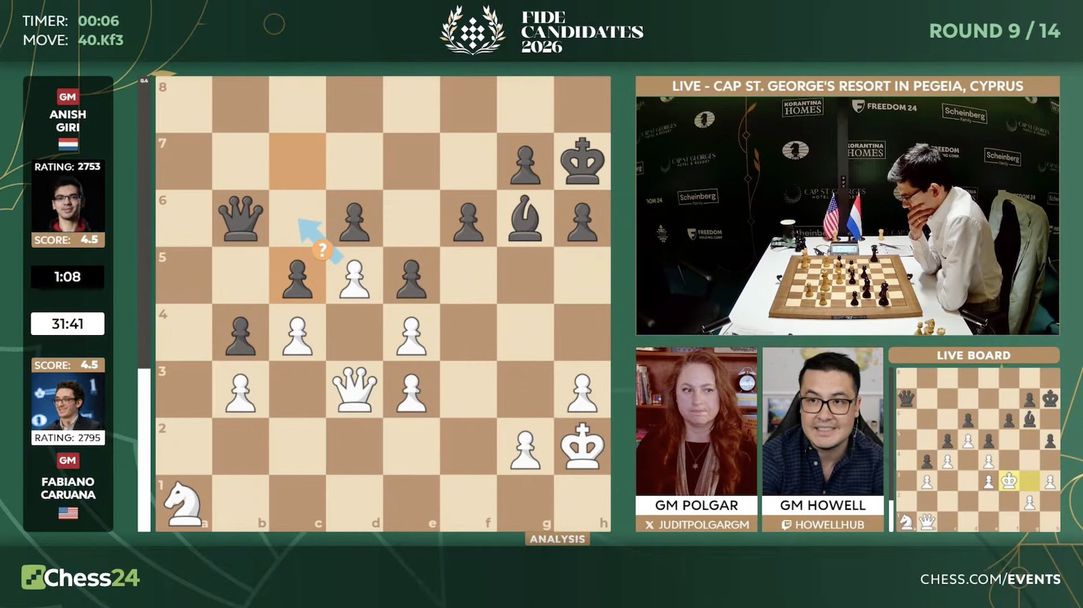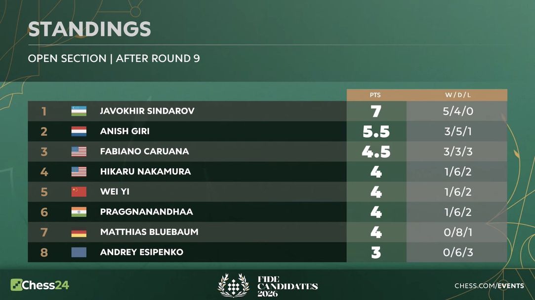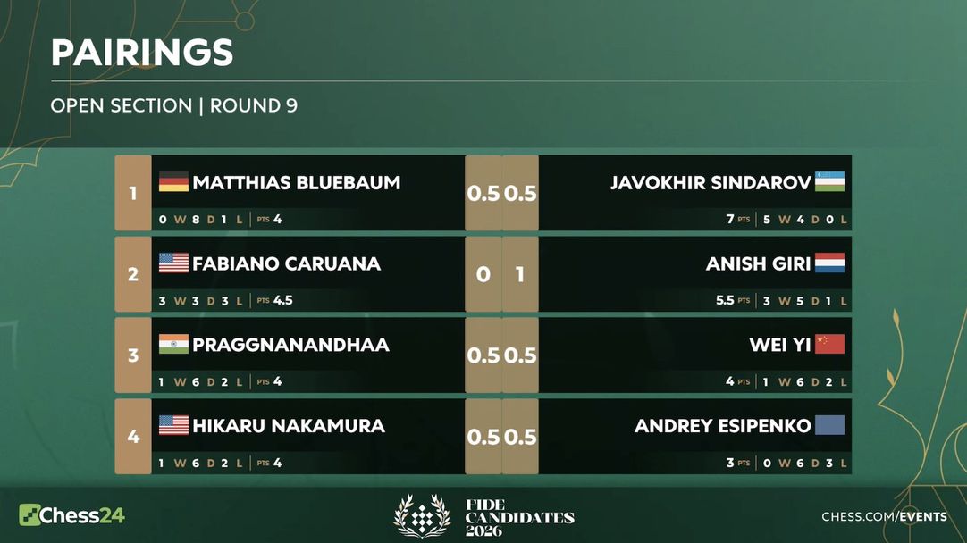 Гросмайстор (ГМ) Аниш Гири изигра позиционен шедьовър, за да победи ГМ Фабиано Каруана и да заеме еднолично второто място в Турнира на претендентите на ФИДЕ 2026 след деветия кръг. ГН Жавохир Синдаров можеше да запише рекордна шеста победа, но допусна грешка срещу ГМ Матиас Блюбаум и преднината му беше намалена до 1.5 точки. На другите дъски ГМ Прагнананда Рамешбабу пропусна печеливша позиция срещу ХМ Уей И, докато ГМ Андрей Есипенко издържа дългата преса на ГМ Хикару Накамура.