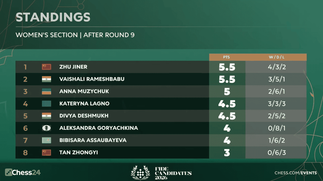 ГМ Джу Дзинер и Вайшали Рамешбабу водят в Турнира на претендентките на ФИДЕ 2026 с по 5.5 точки след девет кръга. Вайшали победи сънародничката си ГМ Дивя Дешмук, а Джу се наложи над ГМ Катерина Лагно във втората си поредна победа. ГМ Анна Музичук имаше добър шанс да нанесе трета поредна загуба на ГМ Тан Джонги, но партията завърши реми, както и двубоят между ГМ Александра Горячкина и ГМ Бибисара Асаубаева.