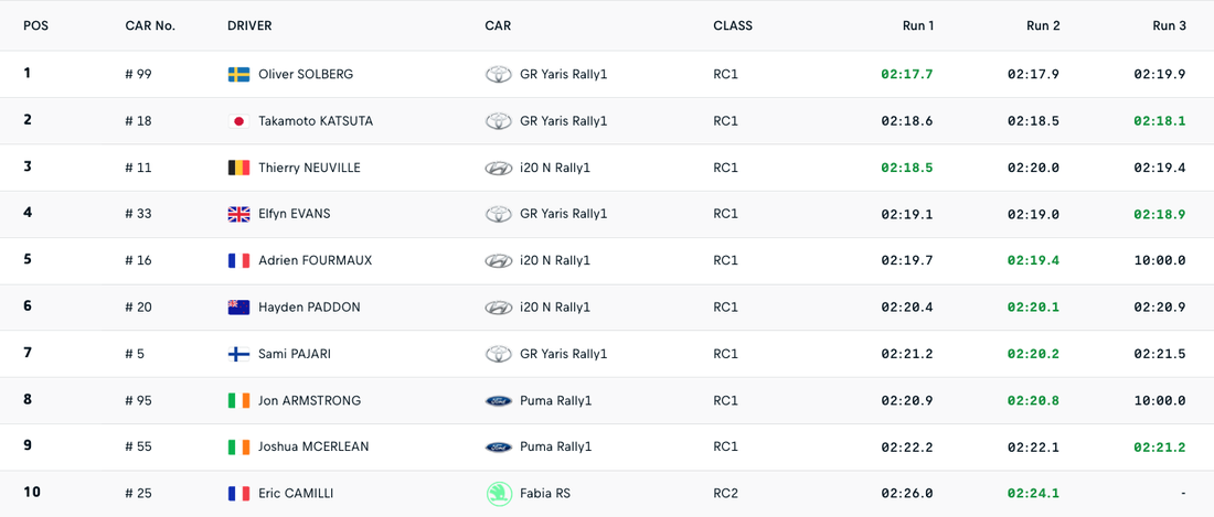 Тройката с пасив от 0.8 оформи Тиери Нювил с Хюндай, а непосредствено зад него се нареди и лидерът в световния шампионат Елфин Еванс. Уелсецът регистрира изоставане от 1.2 спрямо своя най-близък преследвач в генералното класиране Солберг.