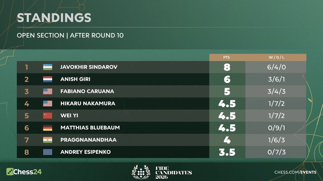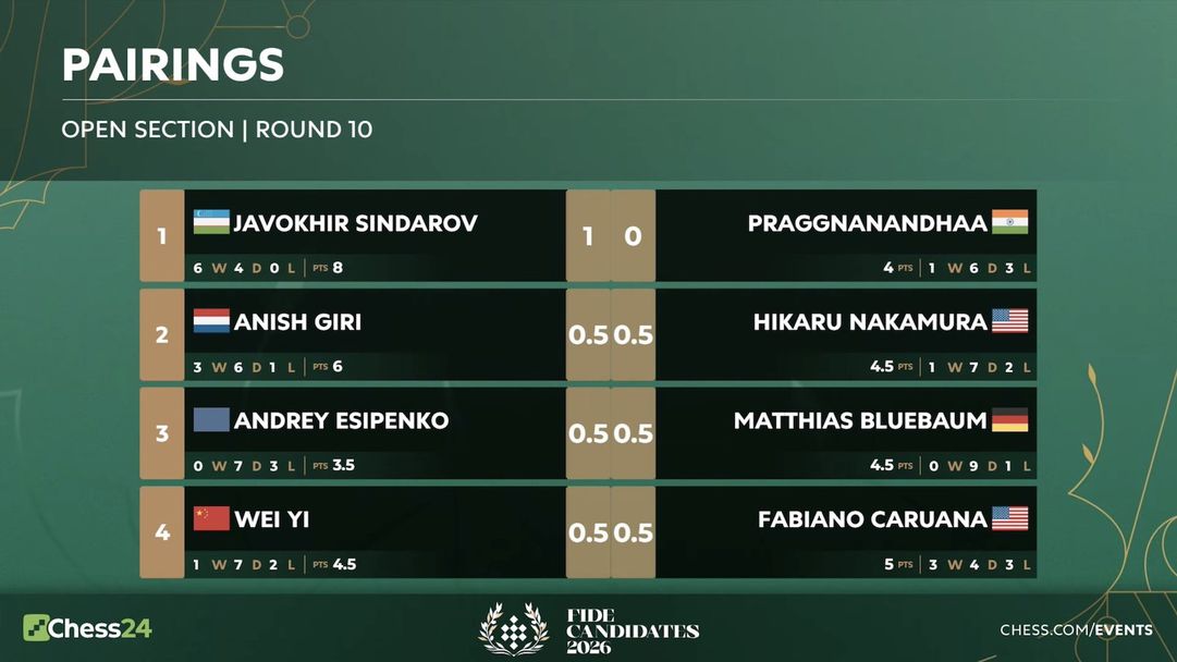 Турнирът на претендентите на ФИДЕ 2026 след 10-ия кръг продължава да бъде шоуто на гросмайстор (ГМ) Жавохир Синдаров, който води с две точки. Узбекската звезда записа рекордна шеста победа срещу ГМ Прагнананда Рамешбабу и вече държи рекорда за най-много победи в модерния формат на претендентите (от 2013 г.). Всички останали партии — ГМ Аниш Гири срещу ГМ Хикару Накамура, ГМ Уей И срещу ГМ Фабиано Каруана и ГМ Андрей Есипенко срещу ГМ Матиас Блюбаум — завършиха реми.