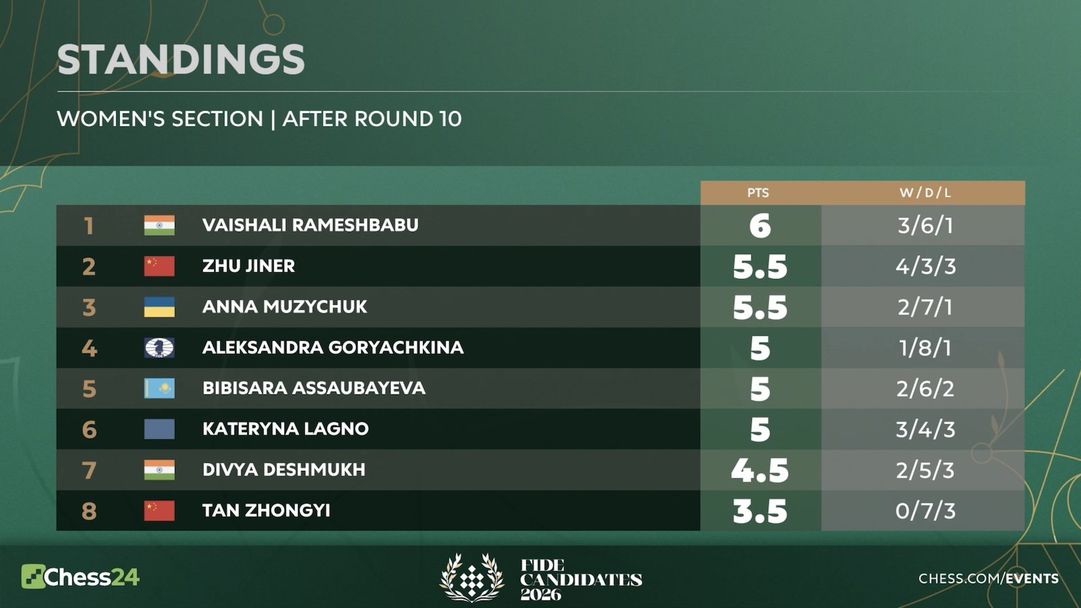 Спокойно реми за ГМ Вайшали Рамешбабу срещу ГМ Анна Музичук беше достатъчно индийката да излезе еднолично начело в Турнира на претендентките на ФИДЕ 2026, след като другата лидерка ГМ Джу Дзинер отказа реми чрез повторение на позицията и загуби драматично от ГМ Бибисара Асаубаева. Другият решителен резултат беше първа победа за ГМ Александра Горячкина, която нанесе втора поредна загуба на ГМ Дивя Дешмух.