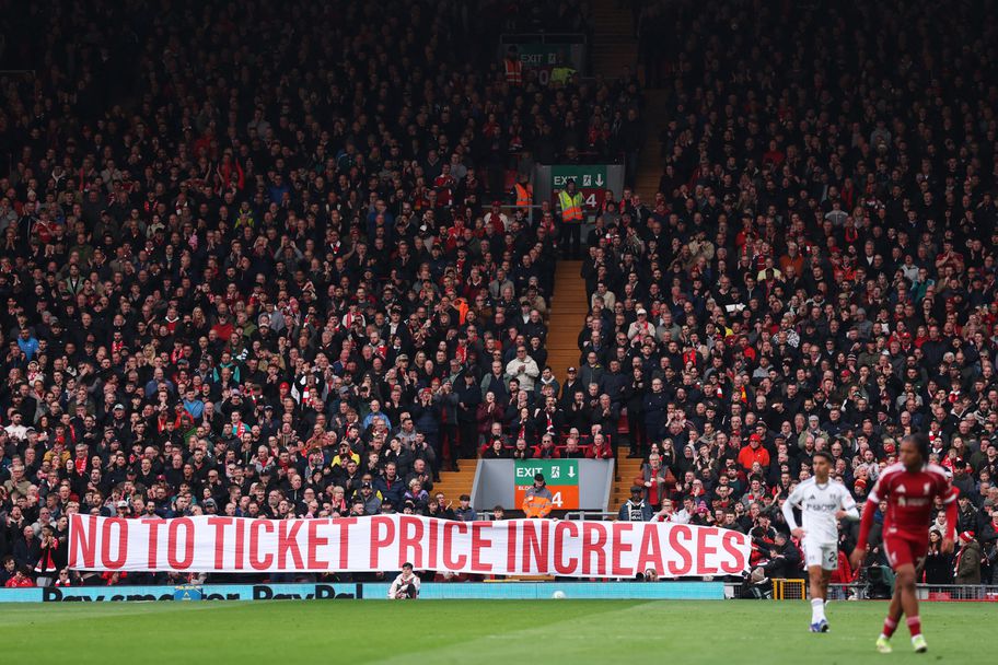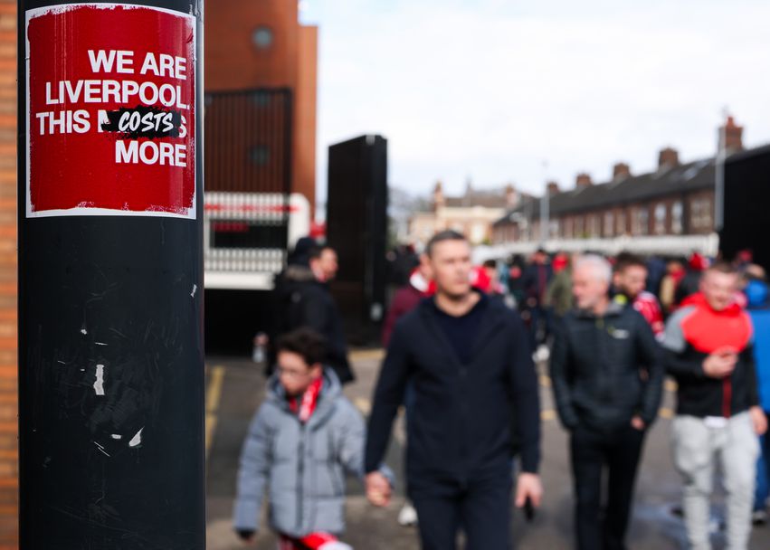 Малко след това последваха скандирания, насочени към собствениците на Ливърпул от Fenway Sports Group, с послания като „заврете си цените отзад“ и „алчни копелета, стига толкова“.