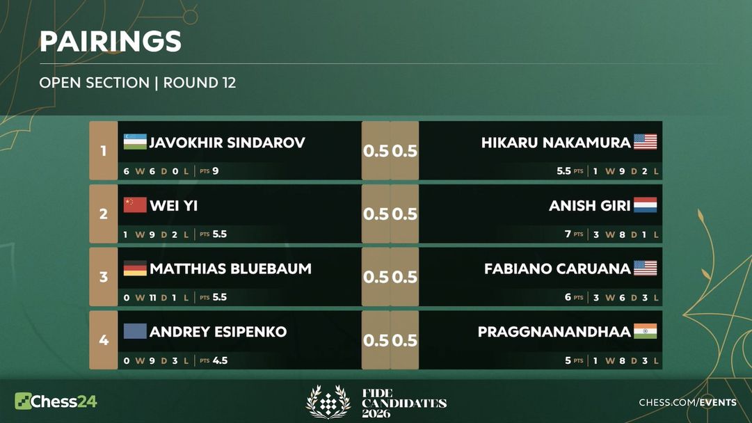 Жавохир Синдаров си гарантира поне тайбрек за спечелване на Турнира на претендентите 2026, след като направи бързо реми за 35 минути срещу Хикару Накамура и запази аванс от две точки при оставащи два кръга. Аниш Гири беше много близо до това да намали изоставането на 1.5 точки преди директния им сблъсък в кръг 13, но позволи на Уей И да се измъкне с реми след 77 хода. Всички партии в мъжкия турнир завършиха реми.