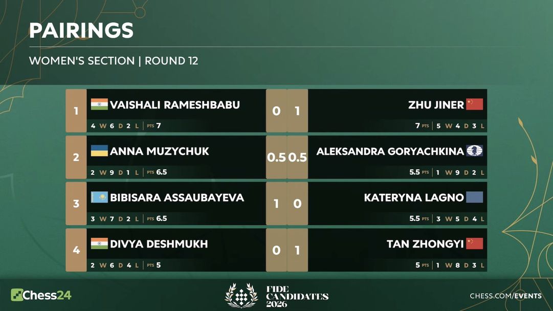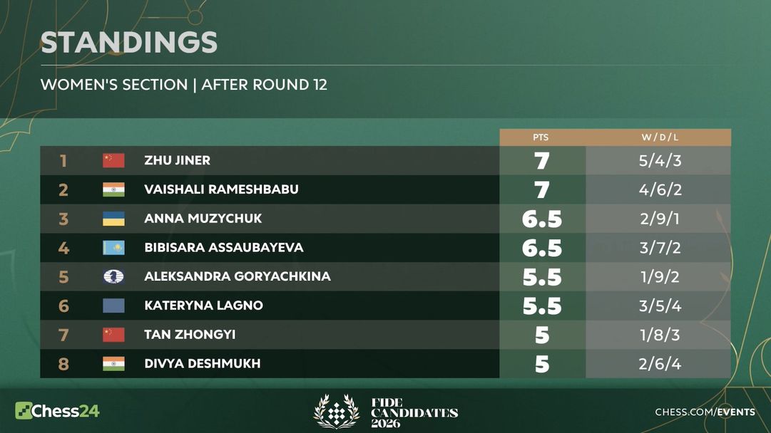 12-тият кръг на Турнир на претендентките 2026 завърши с три решаващи партии. Джу Дзинер победи Вайшали Рамешбабу и я изравни на върха със 7 точки, Бибисара Асаубаева надделя над Катерина Лагно и се доближи на половин точка, а Тан Джонги записа първата си победа в турнира срещу Дивя Дешмух. Единственото реми беше между Анна Музичук и Александра Горячкина, където първата изпусна печеливша позиция заради патов трик в топовия ендшпил.