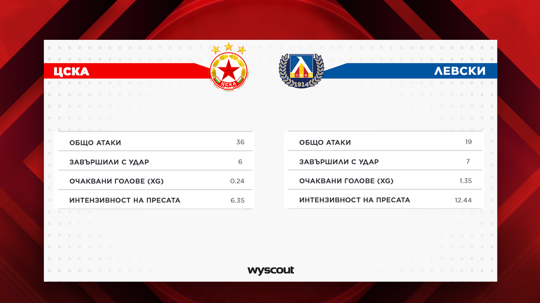 Анализът на статистическите данни в Wyscout показва, че ЦСКА е бил по-активният отбор в атака и е упражнявал по-интензивна преса. Зафиров подчерта бързата реакция на „червените“ при загуба на топката, докато Левски е предпочел да изчаква в определени зони и да блокира ключови футболисти чрез персонални двубои. Въпреки териториалния превес на ЦСКА, чистите голови положения са били минимални и за двата съставa.