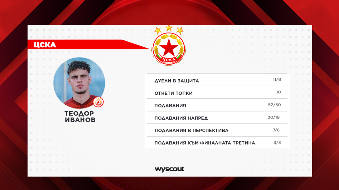 Специално внимание бе обърнато на представянето на Теодор Иванов, който в този мач носи капитанската лента. Неговото преместване от позицията Делова в центъра на защитата се определя като ключово за по-голямата му увереност на терена. Статистиката от осем спечелени единоборства от общо 11, високата точност на подаванията и големият процент пасове в предни позиции потвърждават, че това е неговата естествена позиция.