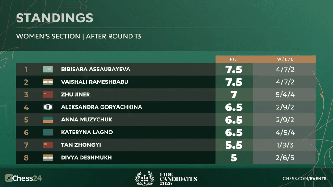 Шест състезателки все още могат да спечелят Турнира на претендентките 2026 преди последния кръг днес, като гросмайсторките Бибисара Асаубаева и Вайшали Рамешбабу делят първото място със 7.5/13.