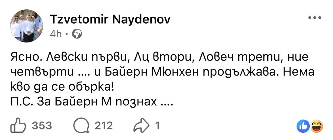 “Ясно. Левски първи, Лц втори, Ловеч трети, ние четвърти …. Нема кво да се обърка!”, написа Найденов.