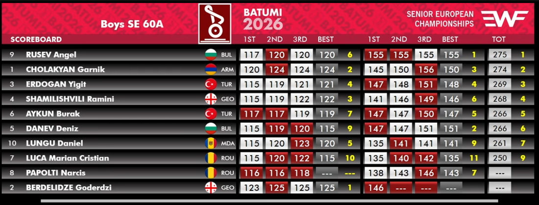 С изключителна ментална и физическа сила, преодолявайки очевидната болка, Ангел се справи от третия опит по невероятен начин със 155 кг. Той излезе начело в класирането на движението и в двубоя, а арменецът Гарник Чолакян единствен имаше шанс да му отнеме титлата. Арменецът обаче не сполучи със 156 и така титлата отиде в България!