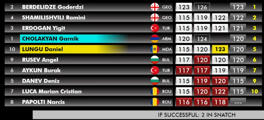 Данев излезе отново на подиума за 119 кг, но за съжаление щангата му "избяга" зад гърба и той не можа да надгради над резултата си. Точно след тази грешка пък Ангел Русев мина на 120 кг, защото преди българите Игит Ердоган и Рамини Шамилишвили бяха преодолели 119 кг.