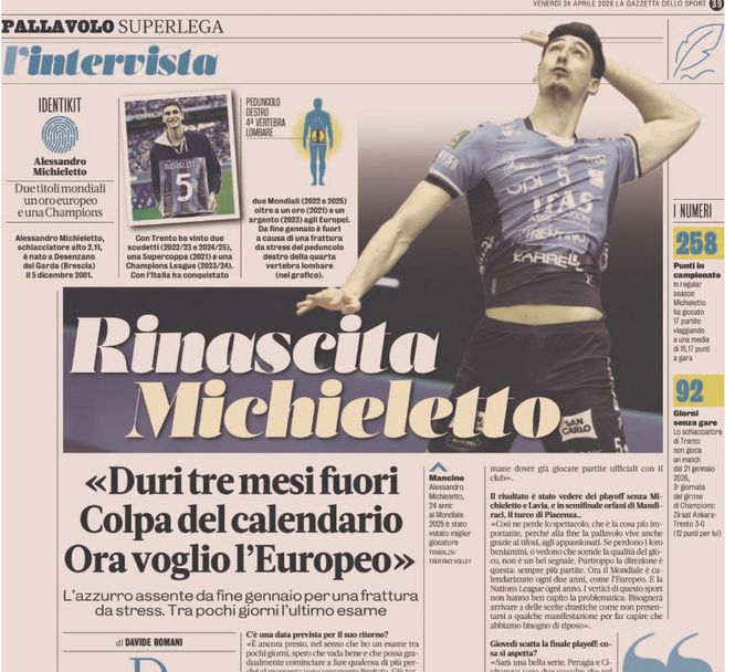 Вече 3 месеца феновете не могат да се възхищават на мощните му забивки и усмивки. Не могат да аплодират острите му сервиси. От 21 януари 2026 г. – денят на последния му мач в Шампионската лига – на италианския волейбол и на Суперлигата им липсва талантът на Алесандро Микиелето. Той е „синият принц“, способен да печели титли и европейски купи с клуба си, както и световни и европейски първенства с националния отбор. Стрес фрактура на дясната дъга на четвърти лумбален прешлен го държи извън игра. Но 24-годишният състезател на Итас Трентино има огромно желание да се завърне и отново да разпали сърцата на феновете.